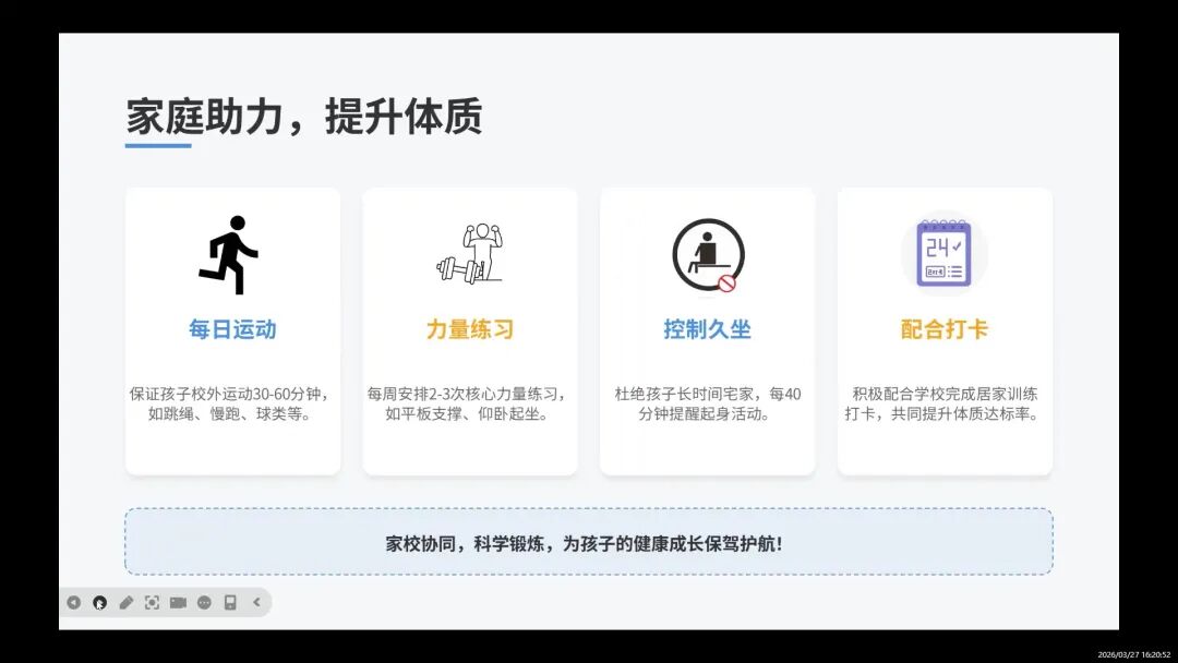 健康置于工作首位,专门成立健康教育专题备课组,围绕体质健康、视力防控、心理健康、美育素养、劳动素养五大核心维度开展集中备课,凝聚团队智慧打磨优质指导内容,为家长提供科学、系统、精准的健康育人指引。通过家长会,学校向家长传递专业的健康管理理念,明确家庭在学生健康成长中的重要职责。班主任依托备课组集中备课成果,结合班级实际学情,开展针对性健康指导,引导家长与学校协同发力,共同守护学生身心健康,为学生成长筑牢坚实的健康防线。