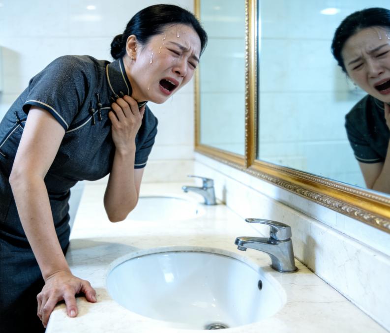 随后她闭紧双眼,左手用力按住跳动不已的太阳穴,试图通过这种方式压制住食管里那股呼之欲出的翻腾感,可额头渗出的冷汗早已糊住了她的视线。