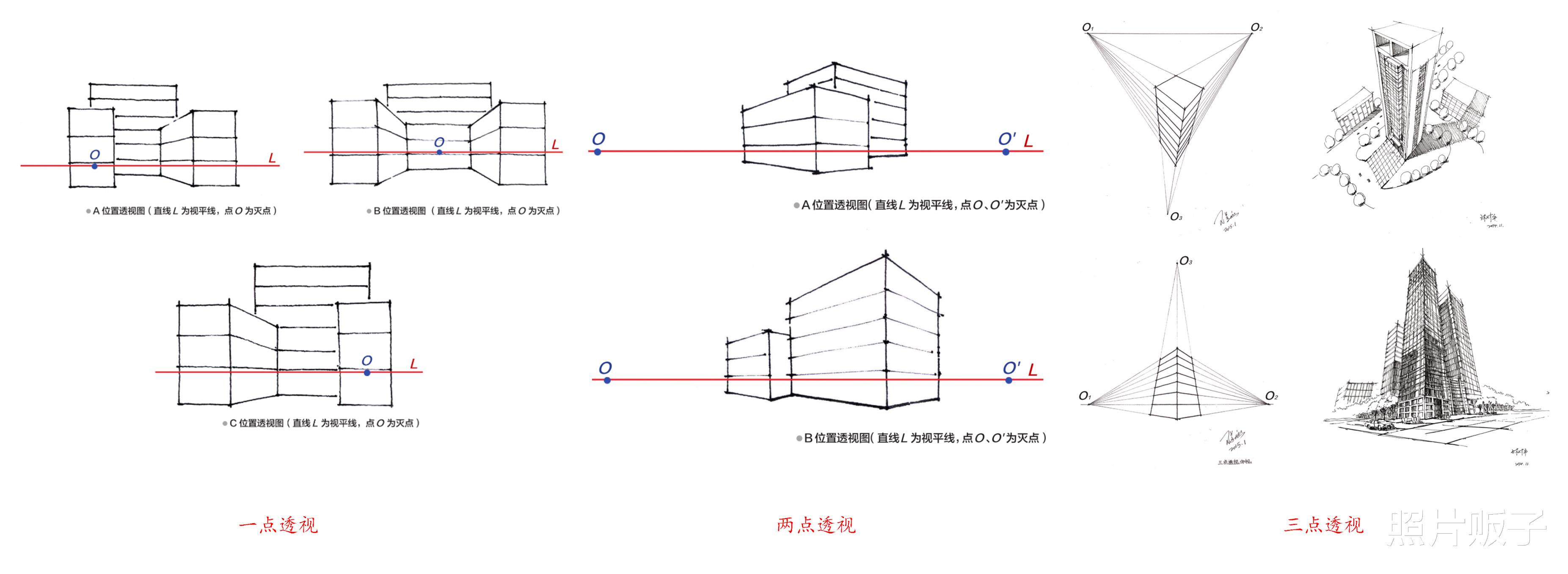 单点透视强调建筑空间的延伸、辽阔和绵长,也强调建筑正面;两点透视强调建筑的庄严及震撼;三点透视用在产品外观设计和效果图居多,拍摄建筑时会有一种尽收眼底的效果。