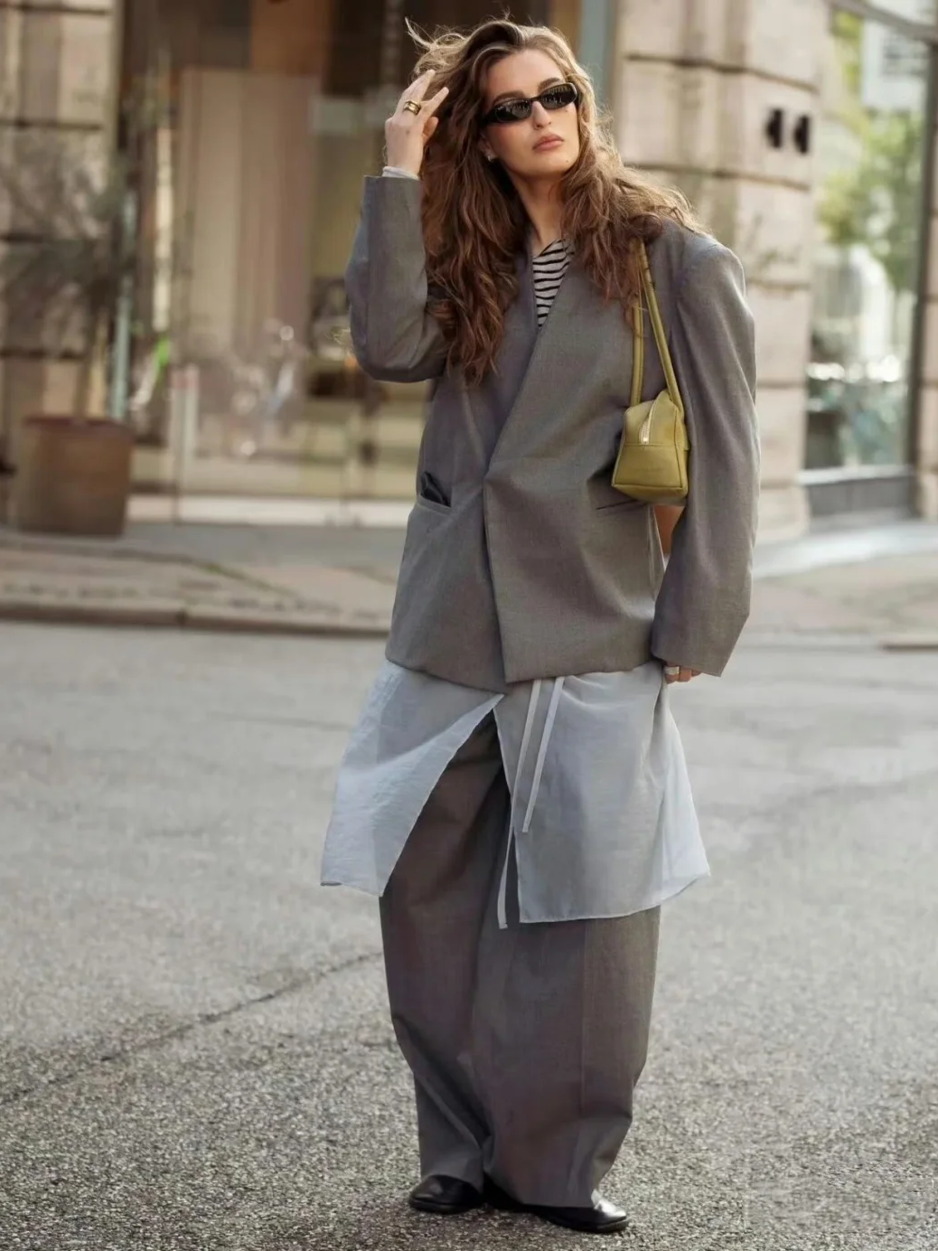 西装的硬朗利落,是通勤场景的 “基础盘”,保证了造型的专业感;而薄纱单品自带轻盈、通透的特质,看似与西装的正式感相悖。