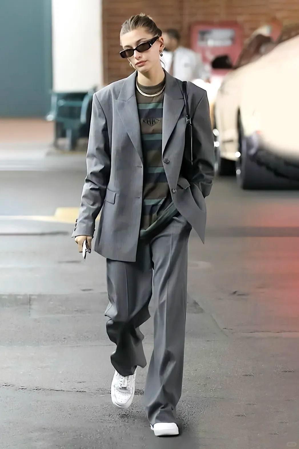 硬挺的西装外套,内搭柔软的针织衫或垂顺的衬衫,不同面料的触感对比,能让叠穿视觉更丰富,却不显杂乱。
