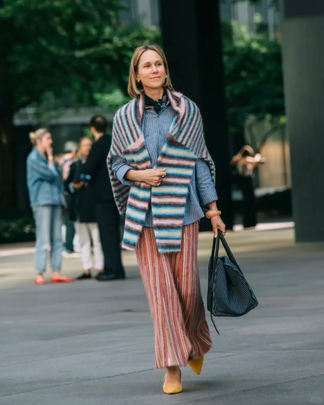 若包含条纹单品,可选择同色系或粗细互补的条纹,或者配纯色系单品,既能形成呼应,又避免图案冲突,让整体更协调。