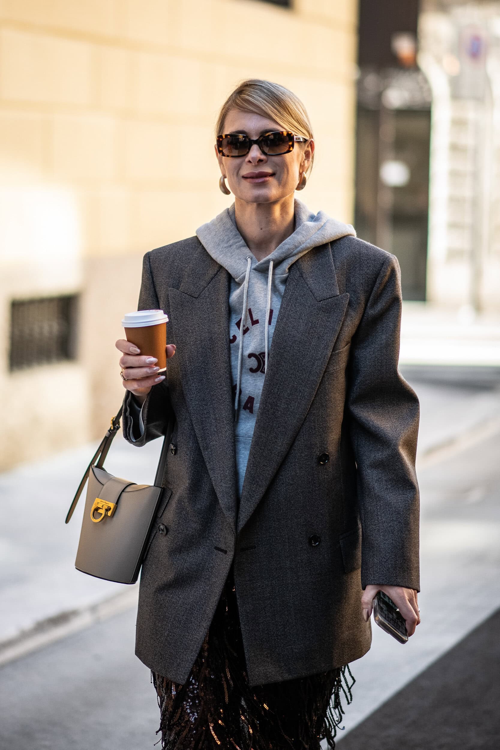 比如西装套装的正式感,和连帽卫衣的休闲运动感形成反差,打破了 “西装只能配衬衫” 的固有认知。