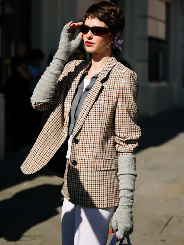 格纹西装的复古腔调,搭配针织手套的精致暖意,让严肃中多了份随性。