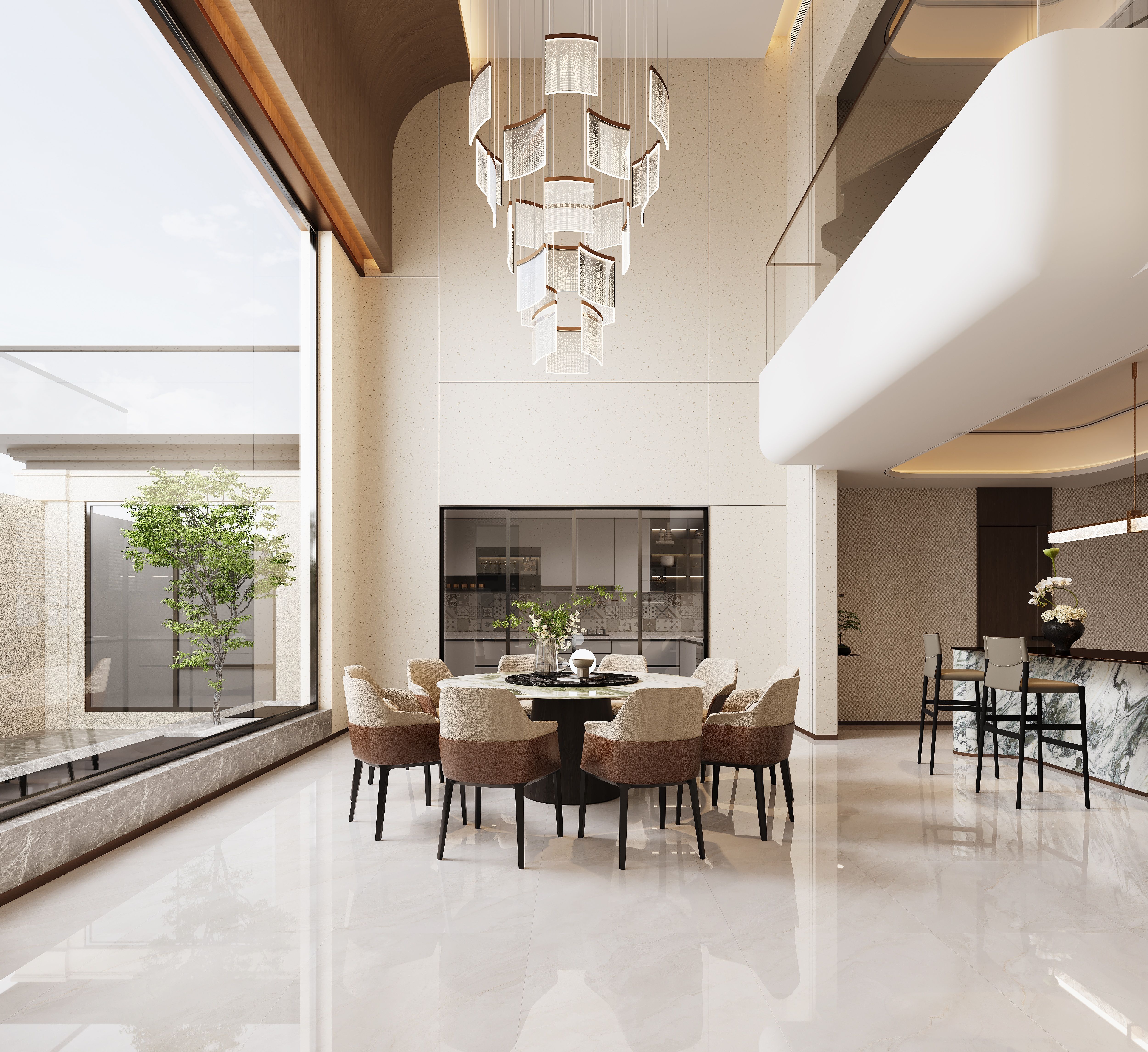 豪宅的精致感,往往藏在 “连贯性” 里。国际瓷砖品牌罗曼缔克芬格白瓷砖能从客厅一路铺到餐厅,同色系、同质感的铺贴让视觉毫无割裂感,仿佛整个公共区域是一个精心设计的 “美学容器”。