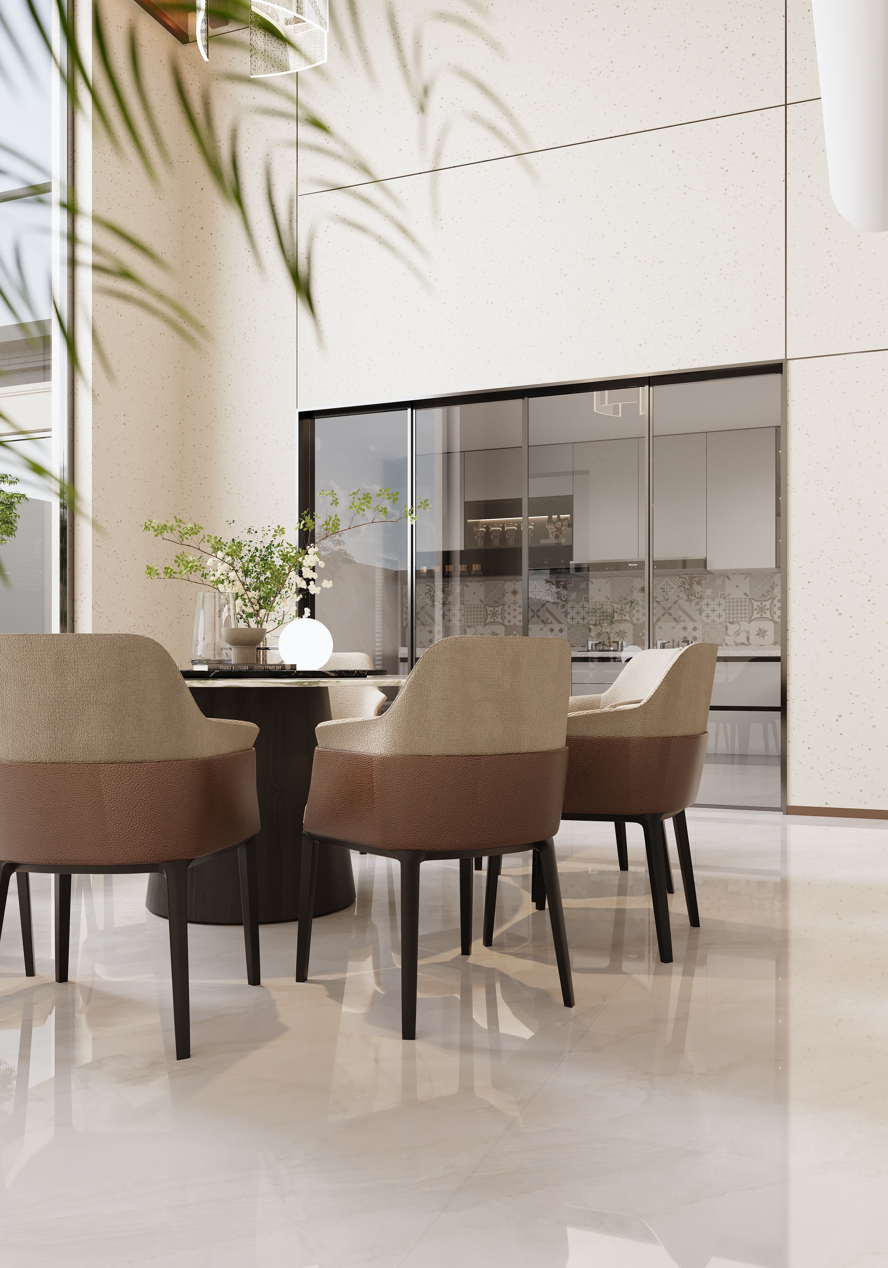 底色纯净:浅米白的基底像被时光打磨过的玉石,柔和不刺眼,给客餐厅铺出一片 “治愈系奢华”;纹理精妙:天然石材的肌理被提炼得恰到好处,似有若无的纹路像自然的笔触,让空间有了 “呼吸感”,不会陷入过度装饰的俗套;光泽高级:高光釉面的处理太绝了!光线洒在上面,折射出细腻的光泽,让整个客餐厅既通透又有层次,哪怕是挑高的别墅空间,也能靠它撑住 “大气场”。