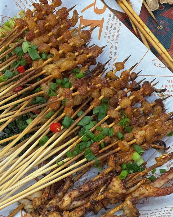 吃烤牛油,一定要趁热。拿起一串,把牛油粒从签子上撸下来,放入口中,轻轻一咬,外皮焦脆,里面的油脂瞬间在嘴里爆开,那种浓郁的脂香充满了整个口腔。辣椒和孜然的香味紧随其后,咸香麻辣,回味无穷。一粒牛油,能让你感受到什么是“一口入魂”。