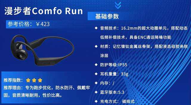 推荐理由:漫步者Comfo Run定位舒适取向开放式运动耳机,专为日常运动、通勤兼顾的人群设计,主打轻量佩戴与长续航,不走极限户外路线,凭借均衡性能、舒适体验与高性价比,适配城市运动与常规训练需求。