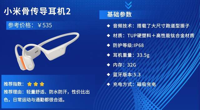 推荐理由:小米骨传导耳机2主打轻量舒适与全场景运动覆盖,延续品牌高性价比,专为日常运动爱好者打造,兼顾佩戴舒适度、均衡音质与强悍防水,适配跑步、骑行、游泳等场景,深受追求便捷实用的运动人群青睐。
