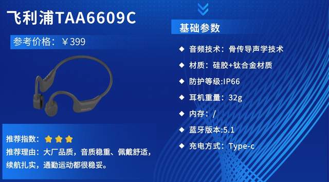 推荐理由:飞利浦TAA6609C定位高性价比入门级骨传导耳机,主打夜跑安全与多场景适配,专为日常运动、通勤人群设计,凭借开放式佩戴、全面功能与亲民价格,成为入门级运动耳机的高性价比之选。