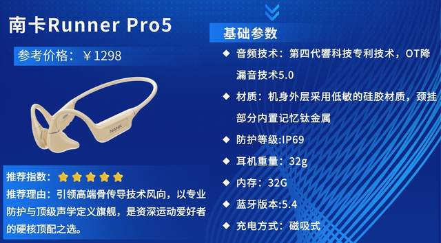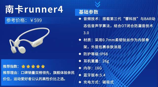 推荐理由:南卡作为骨传导领域稳居TOP1的王牌品牌,凭借自主研发的旗舰级骨振子技术与多项独家专利,在音质、舒适度和防水性能上始终领先行业一代。Runner4作为专为运动打造的旗舰级骨传导耳机,以极致性价比与直逼千元机的音质体验,成为公认的“运动耳机机皇”,真正做到百元价位就能享受旗舰级的功能与性能盛宴!