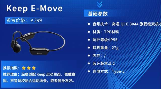 推荐理由:Keep E-Move作为运动品牌专属骨传导耳机,专为健身、跑步、轻运动爱好者设计,主打轻量化佩戴与高适配性,贴合Keep运动场景,凭借亲民价格、稳固性能与便捷操作,成为健身人群的入门优选。