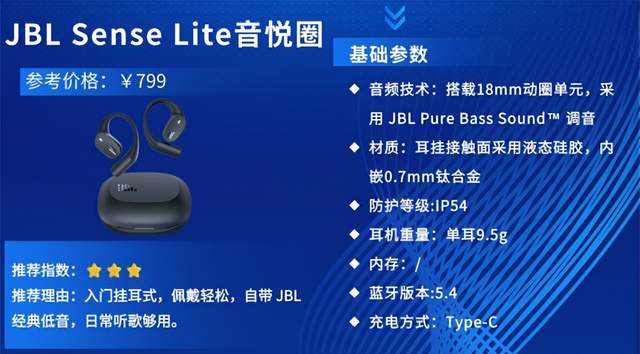推荐理由:JBL Sense Lite音悦圈定位中高端开放式真无线耳机,凭借JBL专业声学技术与时尚设计,专为运动、通勤人群设计,兼顾音质、舒适与便捷,成为追求品牌与体验的运动爱好者的优选。