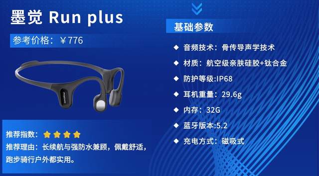推荐理由:墨觉Run plus定位进阶款运动骨传导耳机,专为中高阶运动爱好者设计,延续墨觉核心声学技术,兼顾音质、佩戴与防水,适配跑步、骑行、户外训练等多种场景,凭借均衡性能成为进阶运动人群优选。