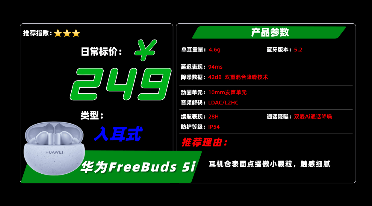 10、华 为F ree Buds 5i蓝牙耳机