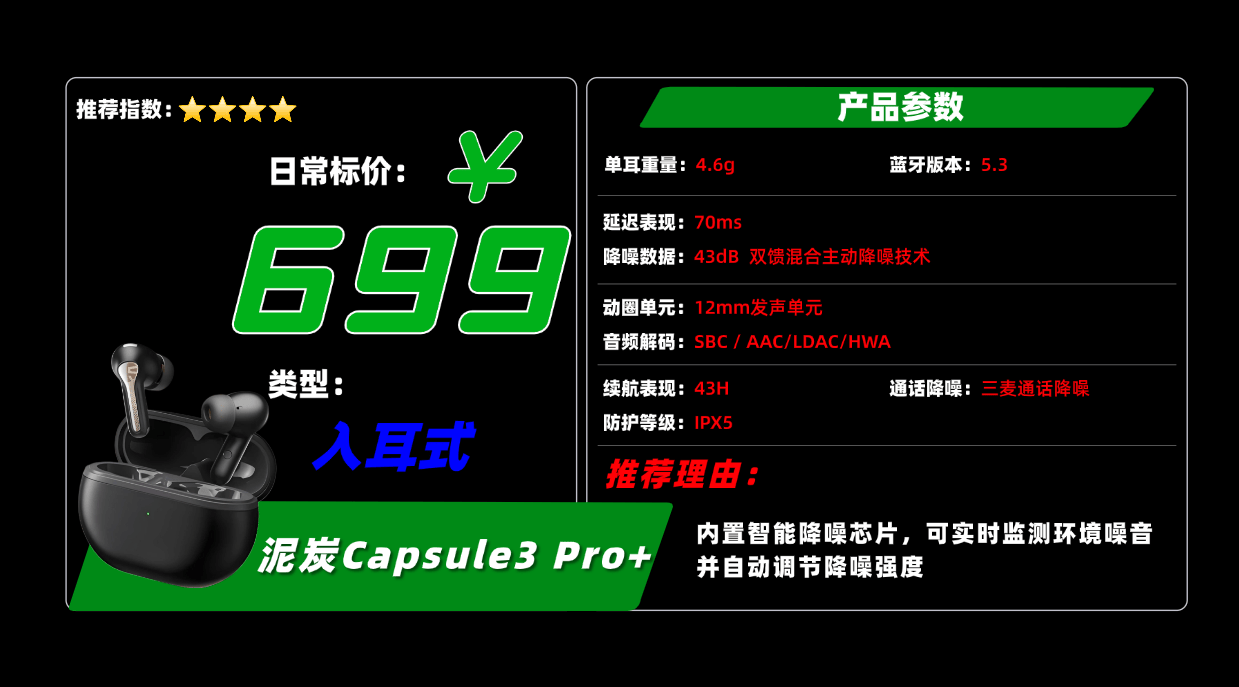 亮点2:音质是它的亮点之一,采用12mm动圈单元,整体声音偏向浓郁风格,低频深沉有力但稍显厚重;中高频解析清晰,人声有种温润感。支持智能音频调节功能,能根据不同使用场景自动优化音效。蓝牙部分升级到5.3版本,连接迅速且稳定,延迟控制在0.2秒左右,打游戏时几乎感受不到延迟。续航表现出色,耳机配合充电仓大概能坚持40小时,对日常使用来说完全足够。唯一小缺点是低频偏重,可能不太适合喜欢均衡音色的人。