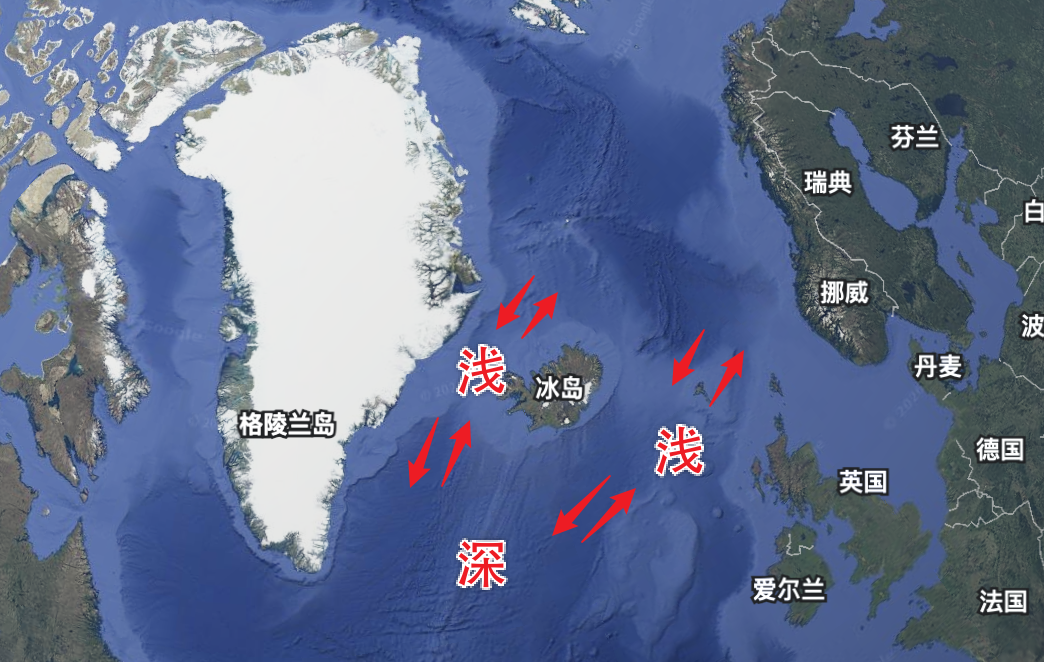 从格陵兰到冰岛,再到英国北部,三块陆地好像三颗钉子,把北大西洋东西两侧的大陆连在一起(用三个地方的字母简称就是GIUK),中间就只剩下两条海峡,丹麦海峡与冰岛-法罗海峡。冰岛,正好生长在正中间。这并不是巧合。