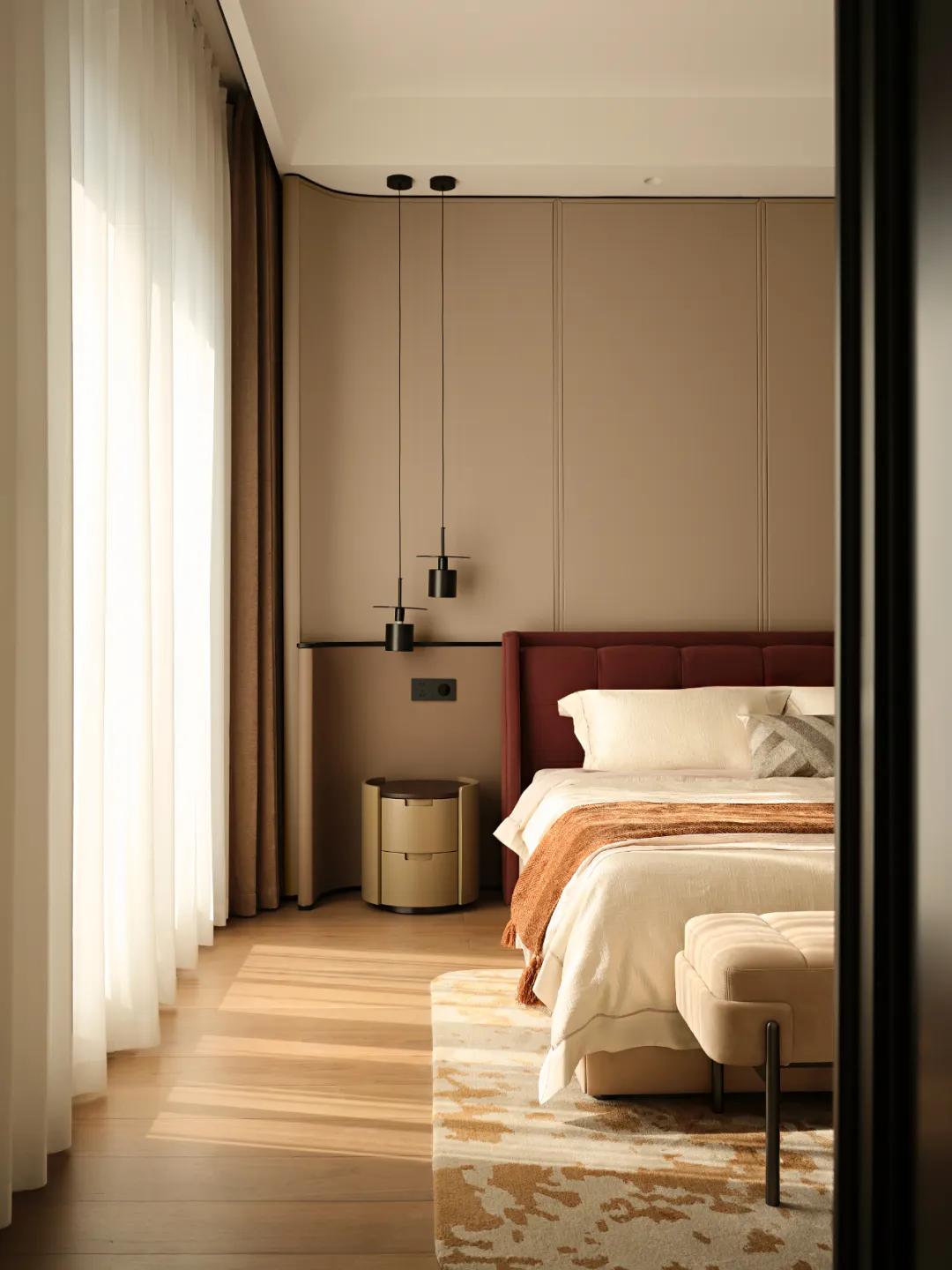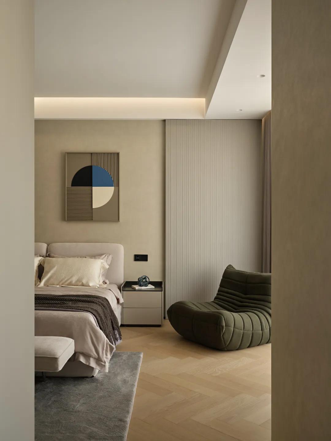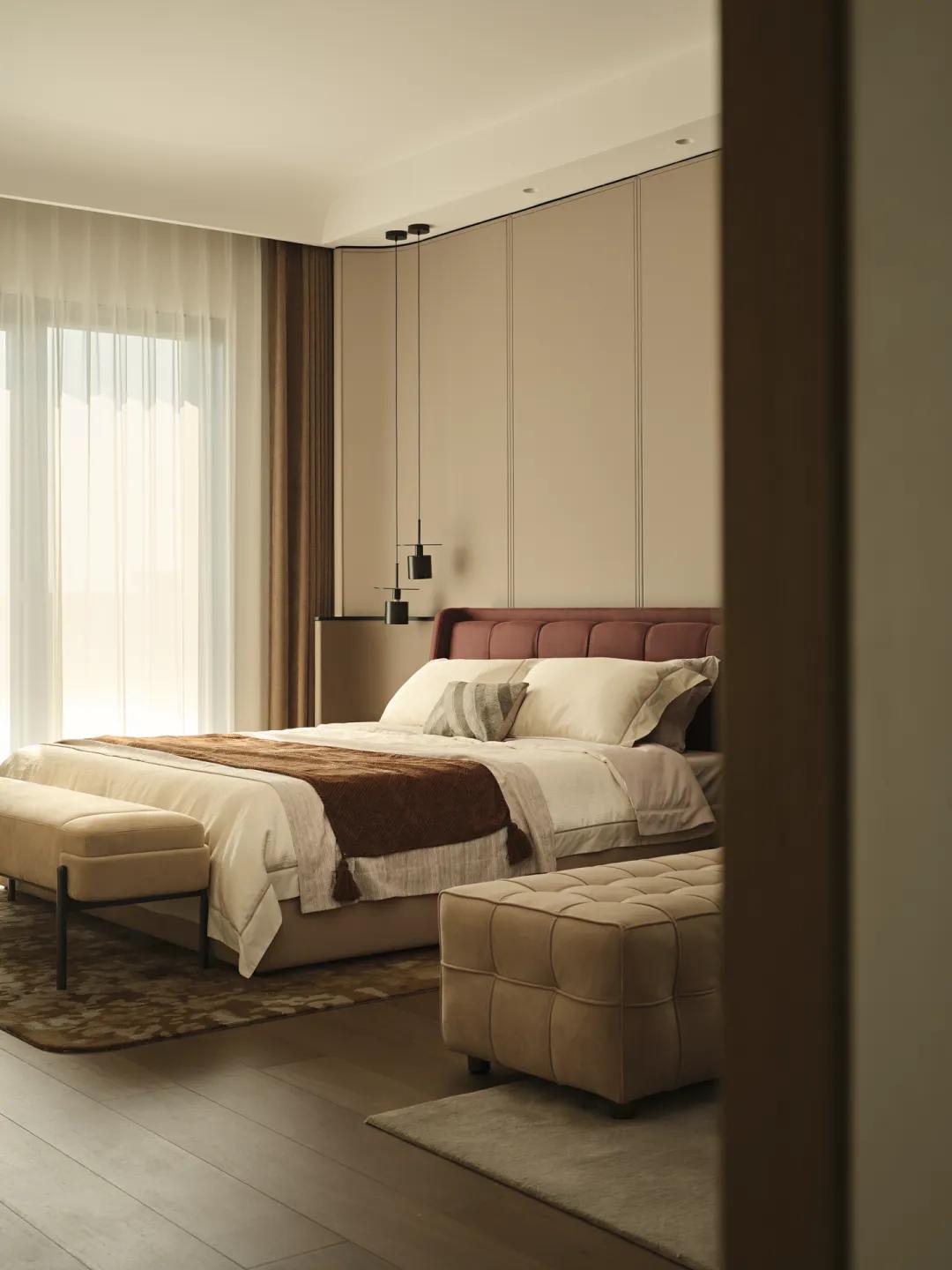 卧室通过弧形元素与质感床品,营造出舒适的休憩氛围。大面积窗户引入自然光线,提升了空间的通透感。于细节处,无主灯设计结合线性灯带与艺术吊灯,构建了“氛围光 + 重点光”的层次照明。金属线条与艺术摆件的点缀,打破了空间的单调;而大理石的天然纹理与实木的温润质感,则共同传递出轻奢设计的精致与高级感。