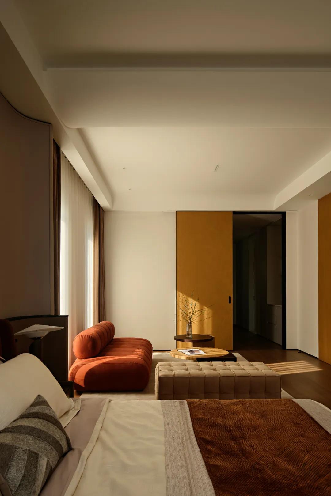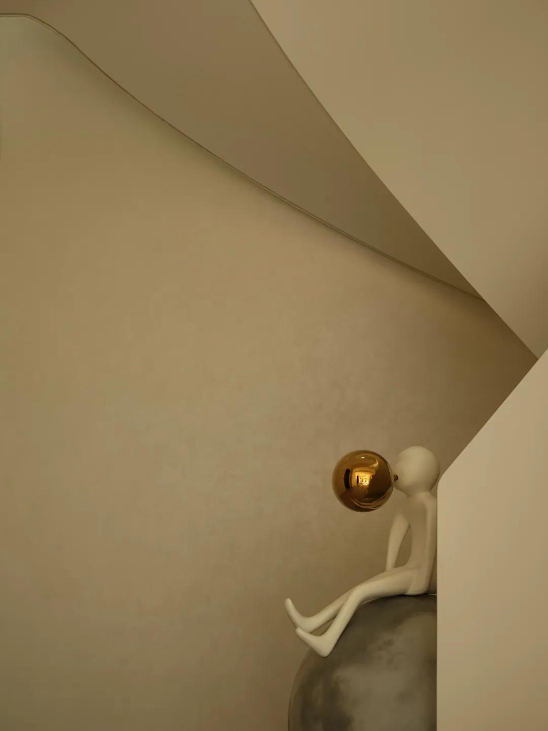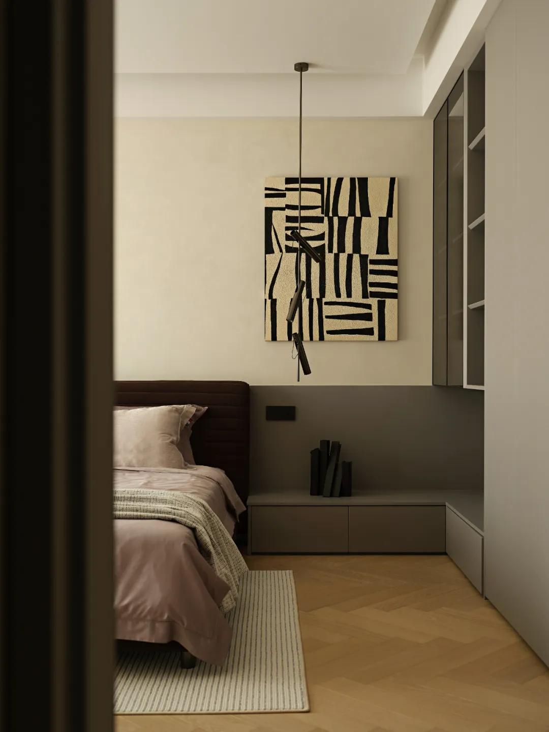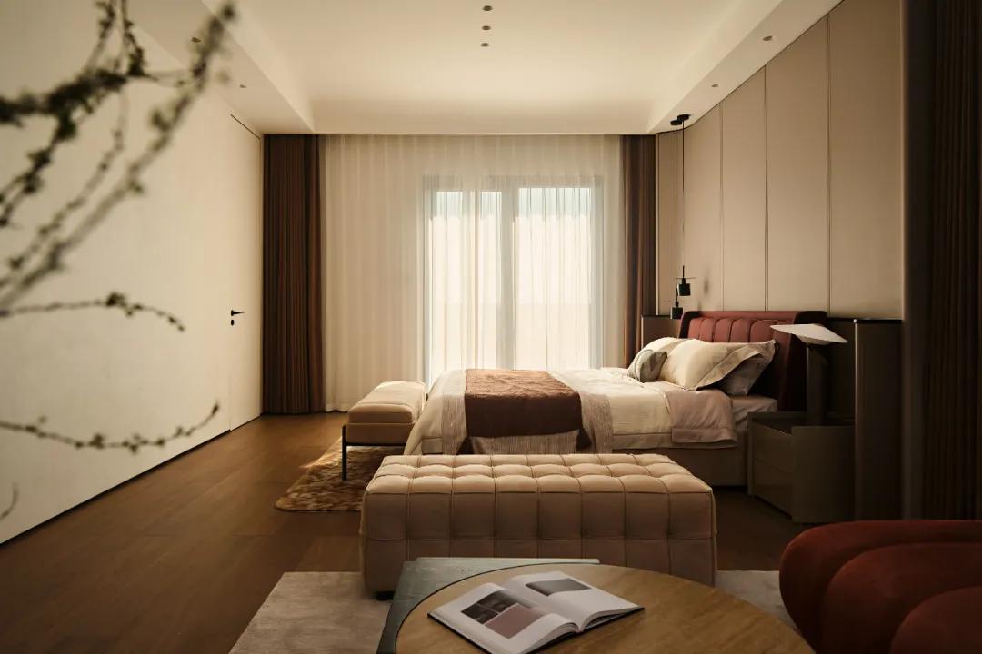 卧室通过弧形元素与质感床品,营造出舒适的休憩氛围。大面积窗户引入自然光线,提升了空间的通透感。于细节处,无主灯设计结合线性灯带与艺术吊灯,构建了“氛围光 + 重点光”的层次照明。金属线条与艺术摆件的点缀,打破了空间的单调;而大理石的天然纹理与实木的温润质感,则共同传递出轻奢设计的精致与高级感。