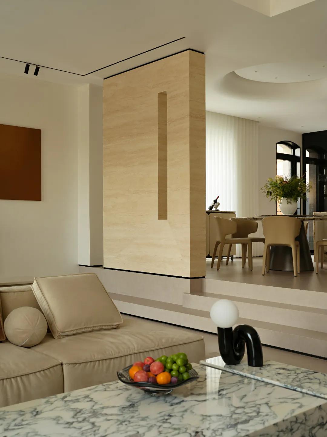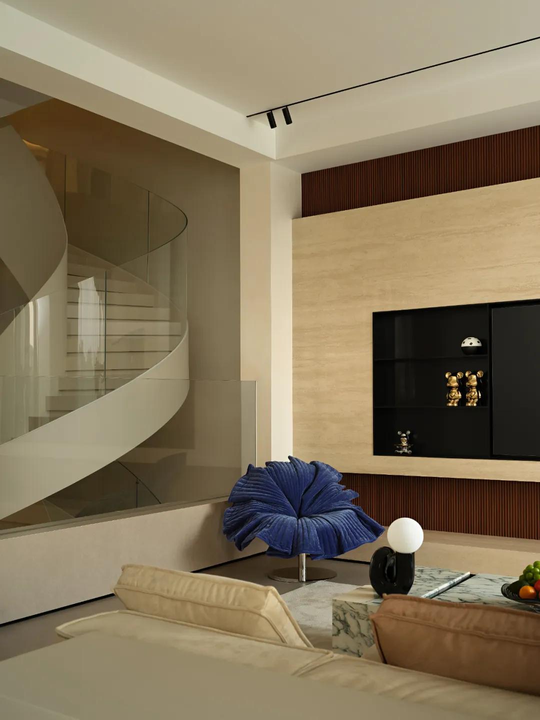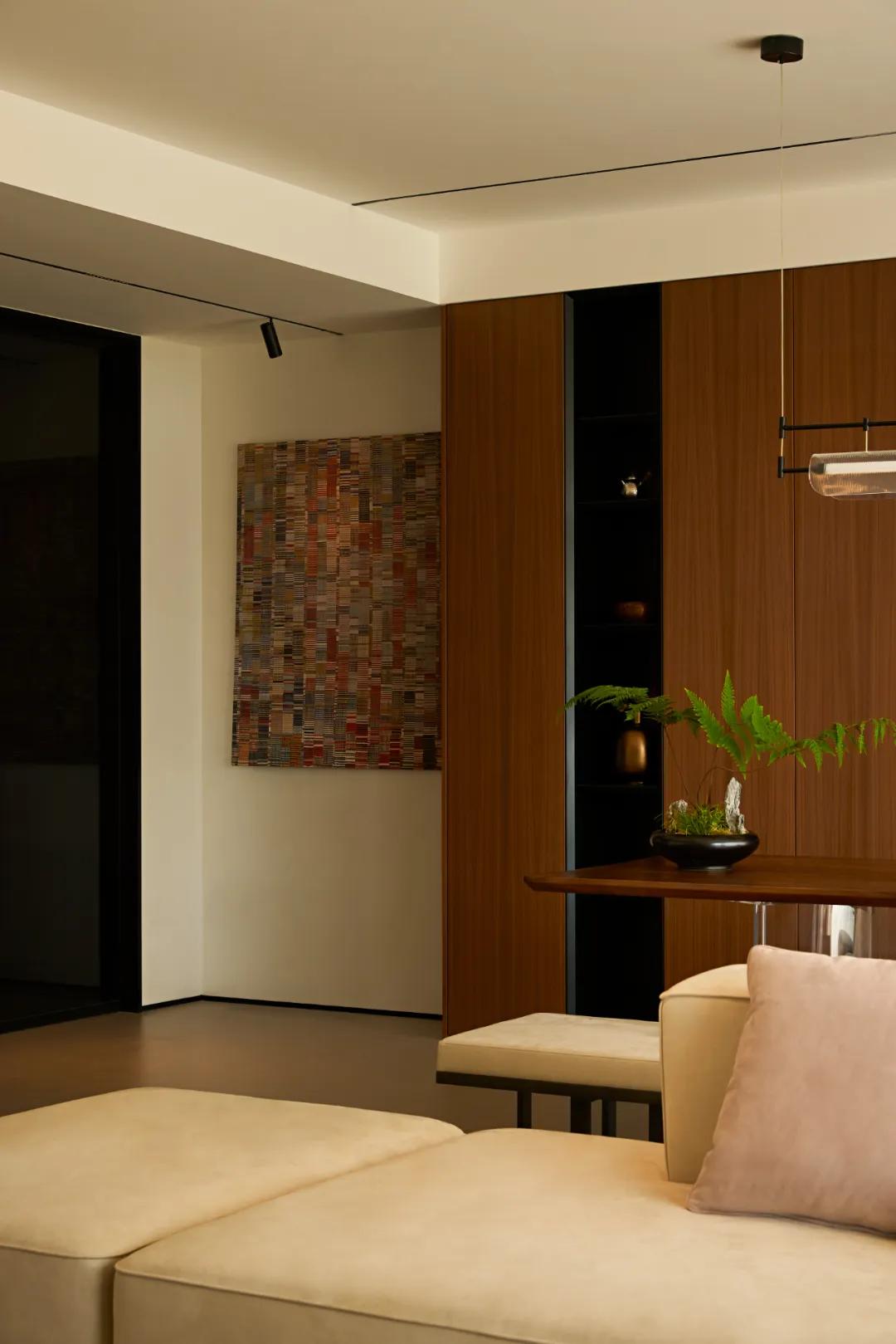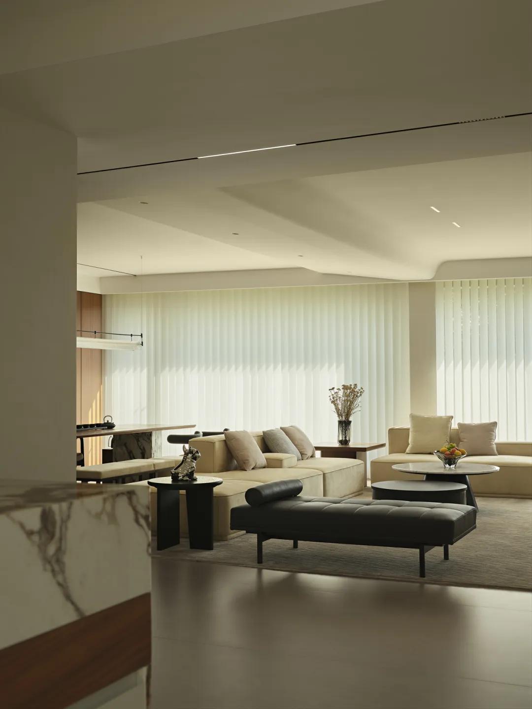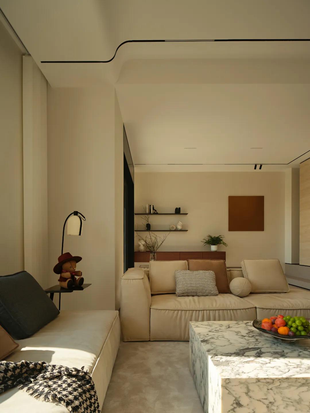 设计遵循居者生活需求,对空间进行科学规划。整体以米白、深棕、大理石灰为基调,运用石材、实木与金属等材质构建层次,从而营造出一种精致且克制的氛围,最终使家成为能够安放身心、促进情感联结的容器。