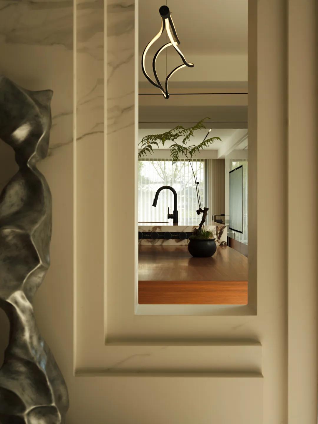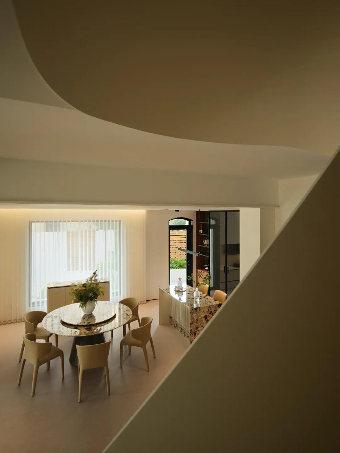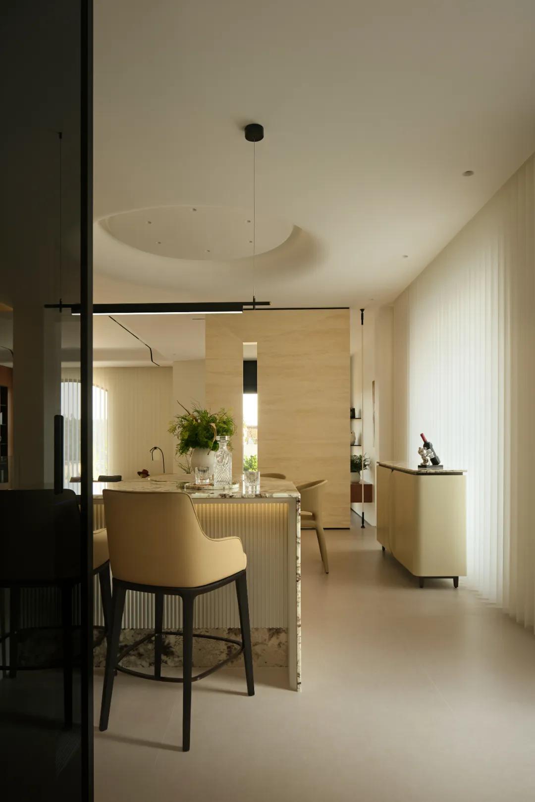 餐厅的圆形大理石餐桌与圆弧型吊顶呼应,强化仪式感;厨房的大理石中岛与木质柜体结合,兼具实用与美学。巧妙的动线布局与功能区划,既保障了餐厨区域的互动开放性,也为每位成员创造了自由轻松的餐食角落。