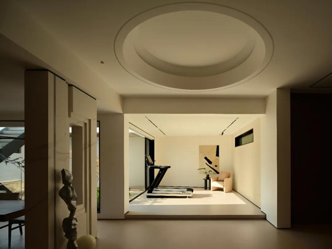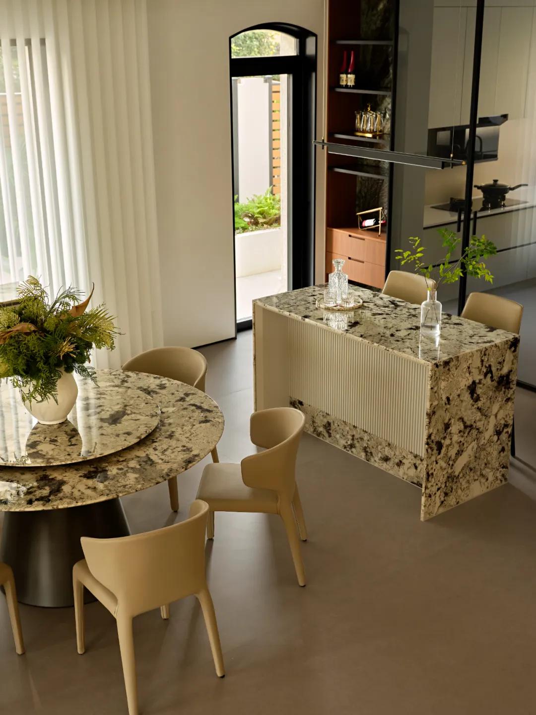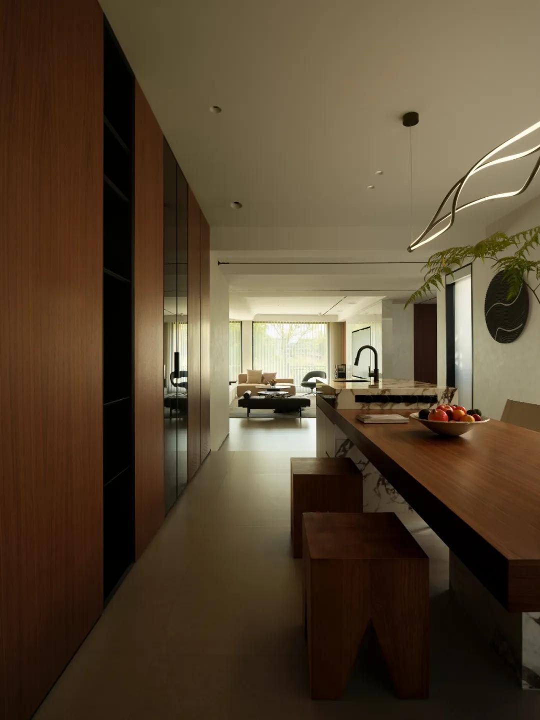 餐厅的圆形大理石餐桌与圆弧型吊顶呼应,强化仪式感;厨房的大理石中岛与木质柜体结合,兼具实用与美学。巧妙的动线布局与功能区划,既保障了餐厨区域的互动开放性,也为每位成员创造了自由轻松的餐食角落。