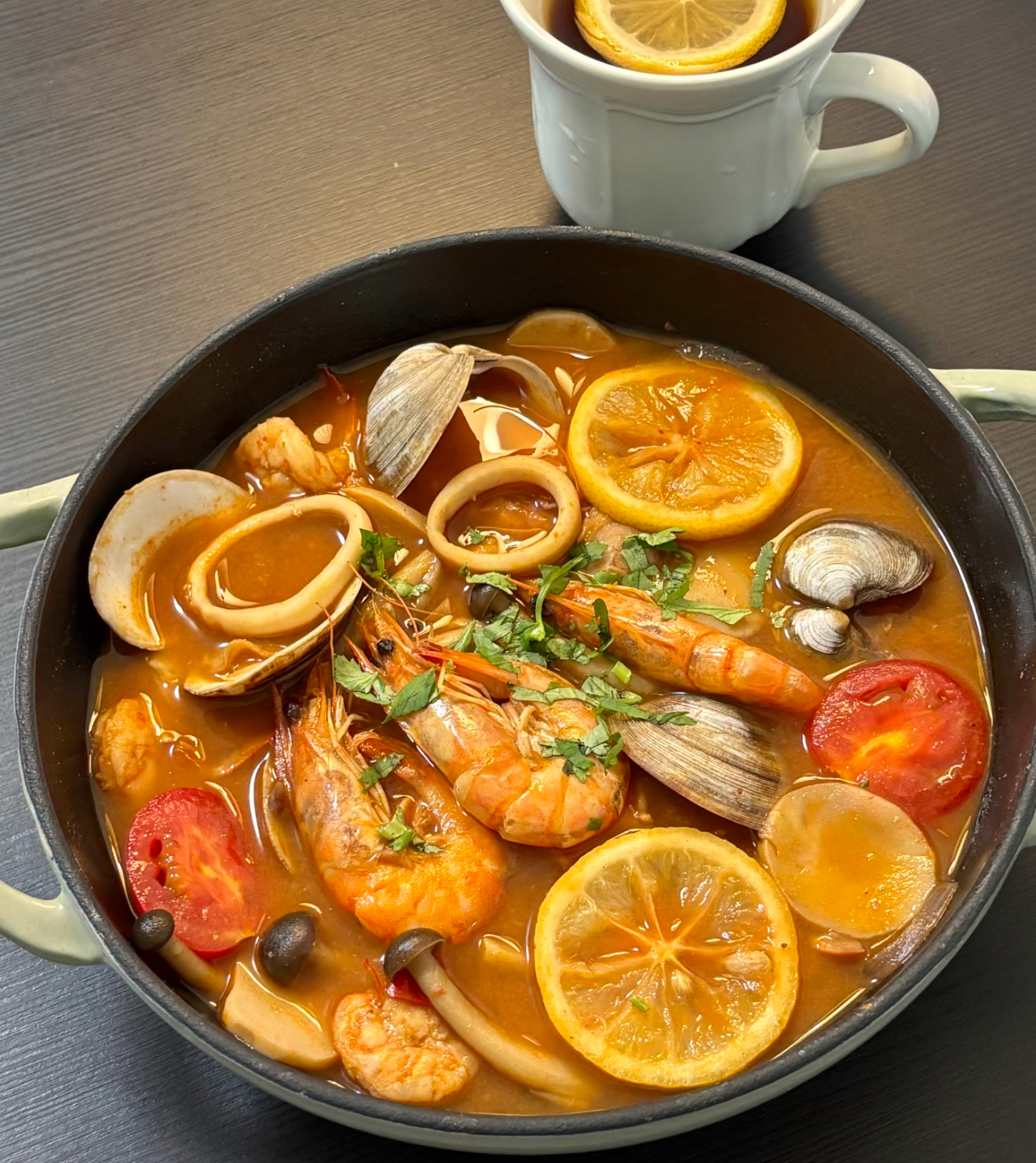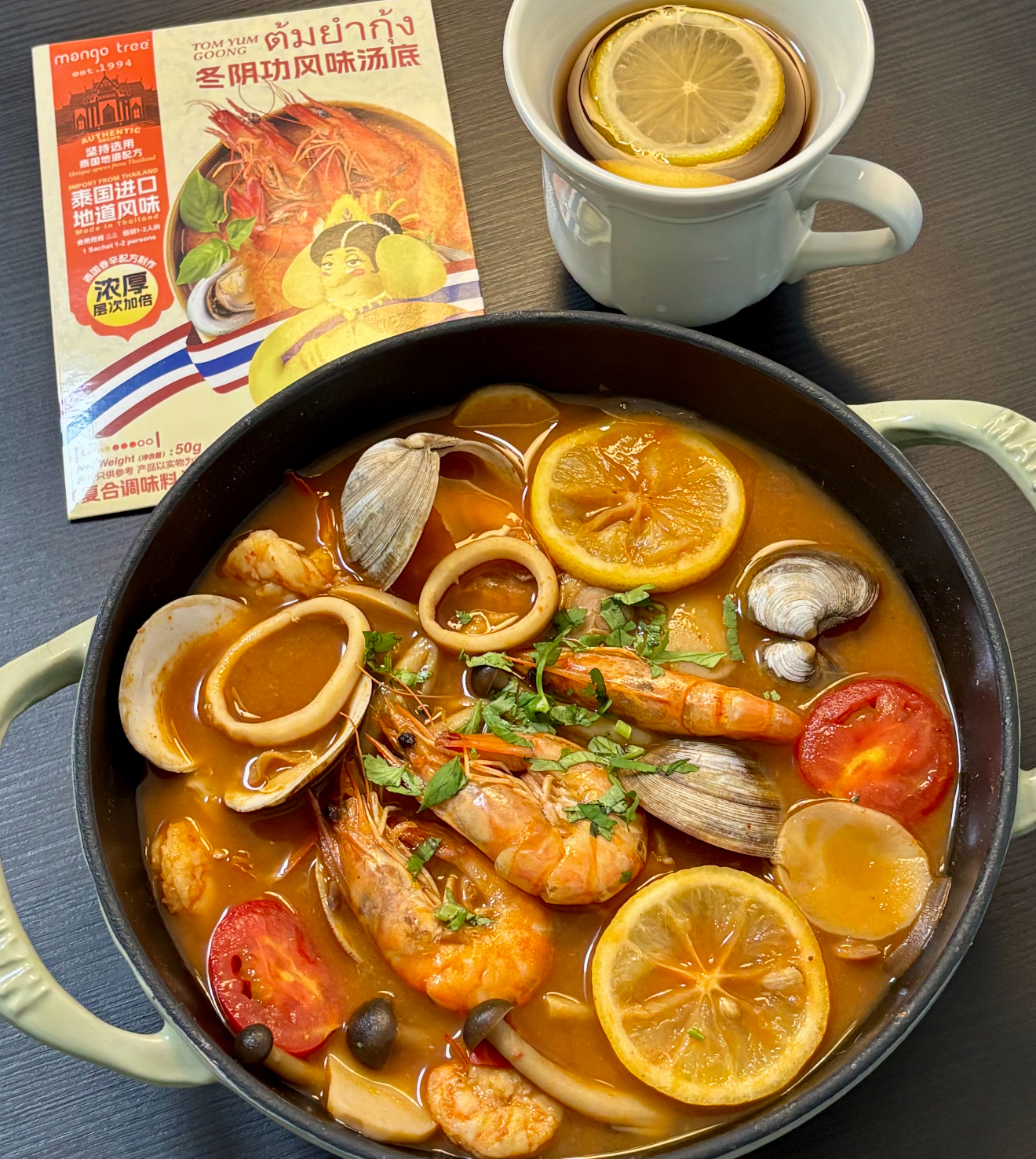 家人们谁懂啊!上周去朋友家聚餐,她端上一锅热气腾腾的泰式冬阴功海鲜锅,那酸辣开胃的香气瞬间弥漫整个房间,直接把我香迷糊了!一口汤下去,酸、辣、鲜、香在舌尖上炸开,再配上鲜嫩的虾、Q弹的鱿鱼,还有各种吸饱汤汁的菌菇,仿佛我瞬间置身于泰国热闹的街头夜市,周围是熙熙攘攘的人群和充满异域风情的摊位。这么好吃的美食,我当场就缠着朋友把做法问了个清楚,今天就来给大家详细分享一下这个超简单的家庭版冬阴功海鲜锅做法。