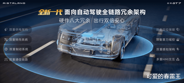 启境GT7拥有同级唯一面向自动驾驶的全链路冗余架构,涵盖感知、计算、供电、转向、制动、通讯、定位及HMI交互八大核心系统的双重冗余设计。即便在极端小概率的硬件失效情况下,车辆仍具备自动靠边停车的Plan B。得益于前瞻硬件预埋,让启境GT7拥有了持续进化能力。待相关法规体系完善,即可通过OTA软件升级,解锁更高阶智驾体验,真正做到常用常新。