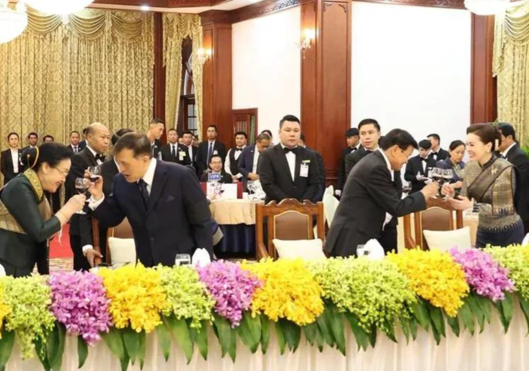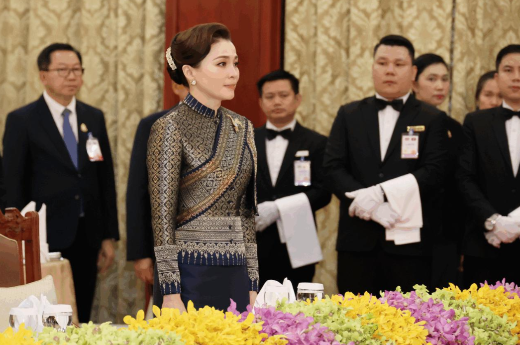 也正是因为物质条件好,他的妻子比他年龄小,举止得体又大方,在老挝宴会上的泰国王后穿着泰式礼服裙,美出新高度!