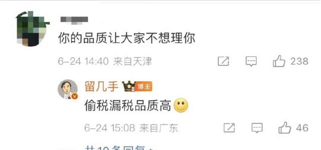 当自己被公开指责品质时,留几手并没有觉得自己有问题,而是直接回复了“偷税漏税品质高”的犀利言论。