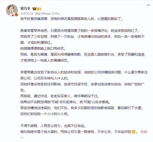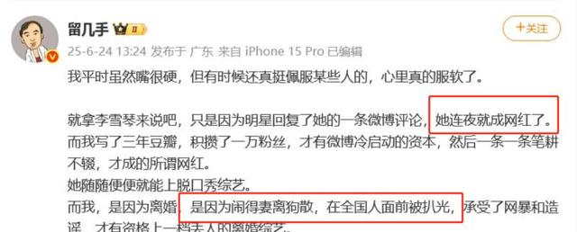 对于李雪琴的成名,留几手的字里行间都充满了不服气,甚至还称李雪琴随随便便就能上脱口秀综艺。