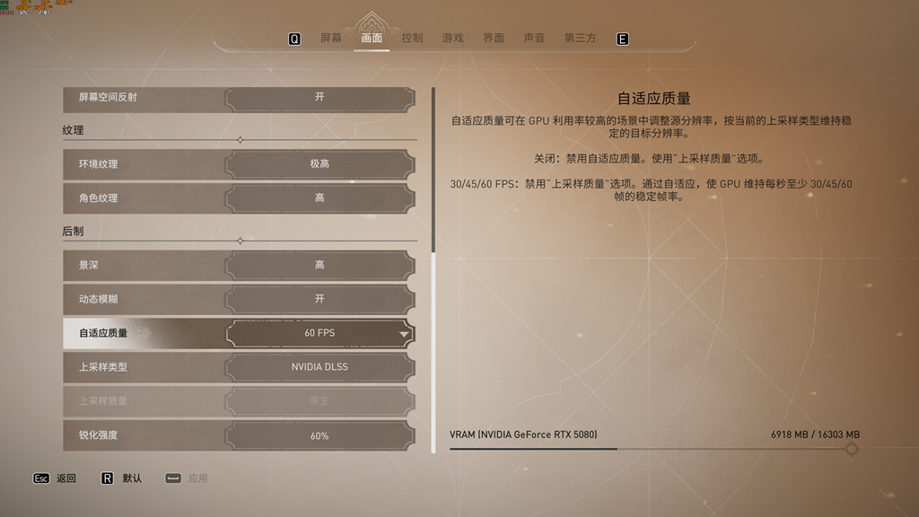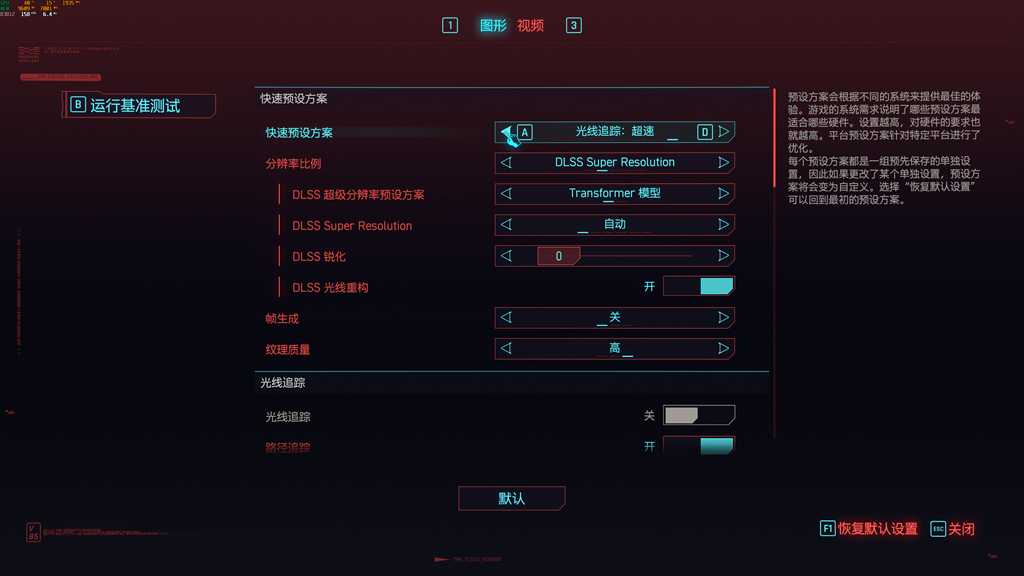 2K分辨率,极高画质,光追散射+反射,打开DLSS画质模式,关闭帧生成,平均帧数71。