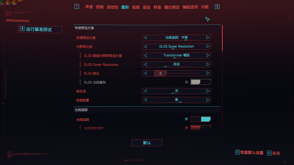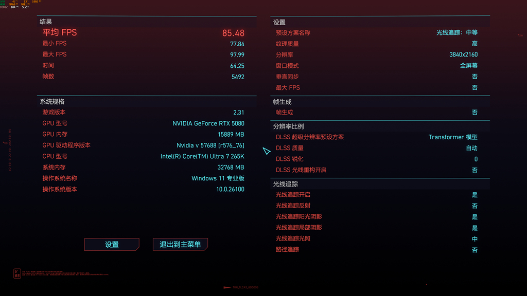 1、4K分辨率,光追中等画质,打开DLSS,关闭帧生成,平均FPS,85。