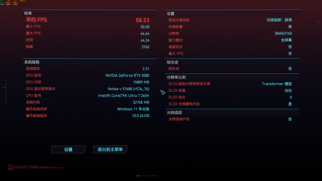 2、4K分辨率,光追超速画质,打开DLSS,关闭帧生成,平均FPS,58。