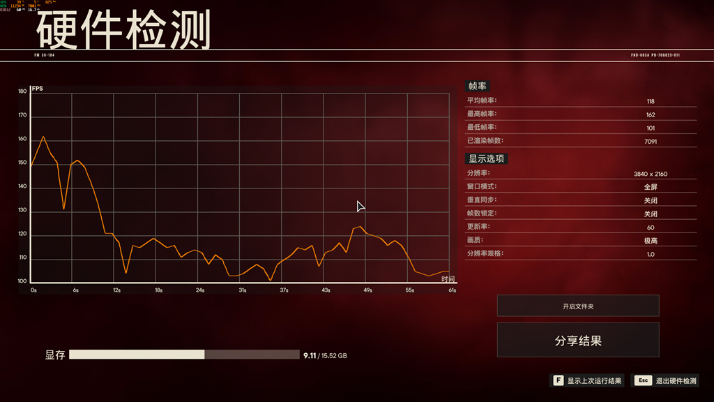 4K分辨率,极高画质,打开FSR平衡模式,平均FPS,118。