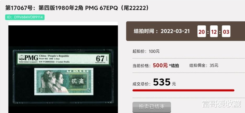 在2022年3月21日的“钱币拍卖会”中,一张(尾22222)的1980年“2角纸币”,其PMG评级分数为67分(带EPQ),最后拍出了535元!
