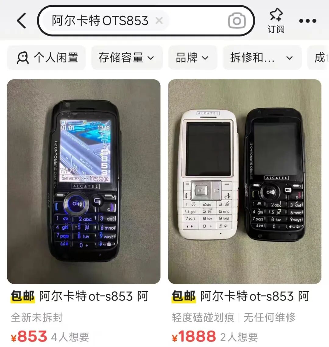 如今前三部音乐手机很好买,二手几十元能拿下,但第四台阿尔卡特OT-S853的价格就起飞了,闲鱼总共就搜到两台,一台是水货英文版开价853元,另一台是行货中文版开价1888元,妥妥的收藏级机型,咱们就当观众看看就好。