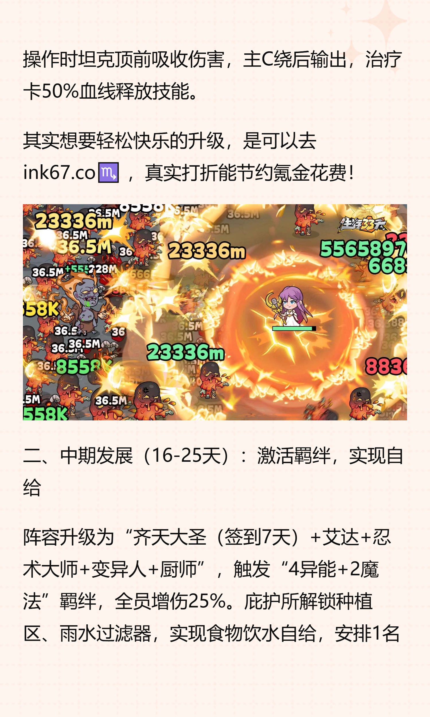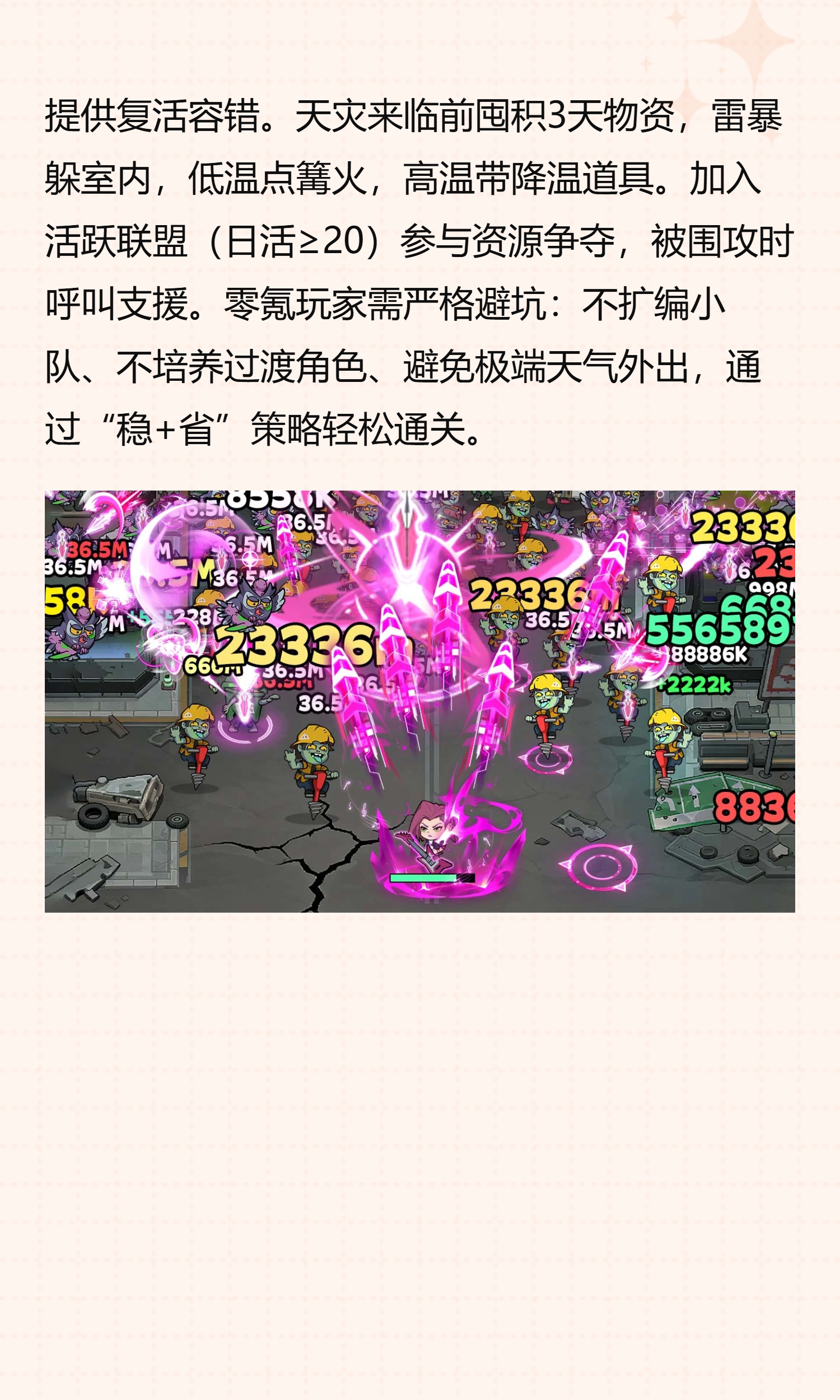 根据场景调整阵容:无尽秘境加入“艾丽莎”聚怪,配合齐天大圣AOE清场;BOSS战用“硬汉”替换辅C,搭配忍术大师减疗,天使提供复活容错。天灾来临前囤积3天物资,雷暴躲室内,低温点篝火,高温带降温道具。加入活跃联盟(日活≥20)参与资源争夺,被围攻时呼叫支援。零氪玩家需严格避坑:不扩编小队、不培养过渡角色、避免极端天气外出,通过“稳+省”策略轻松通关。