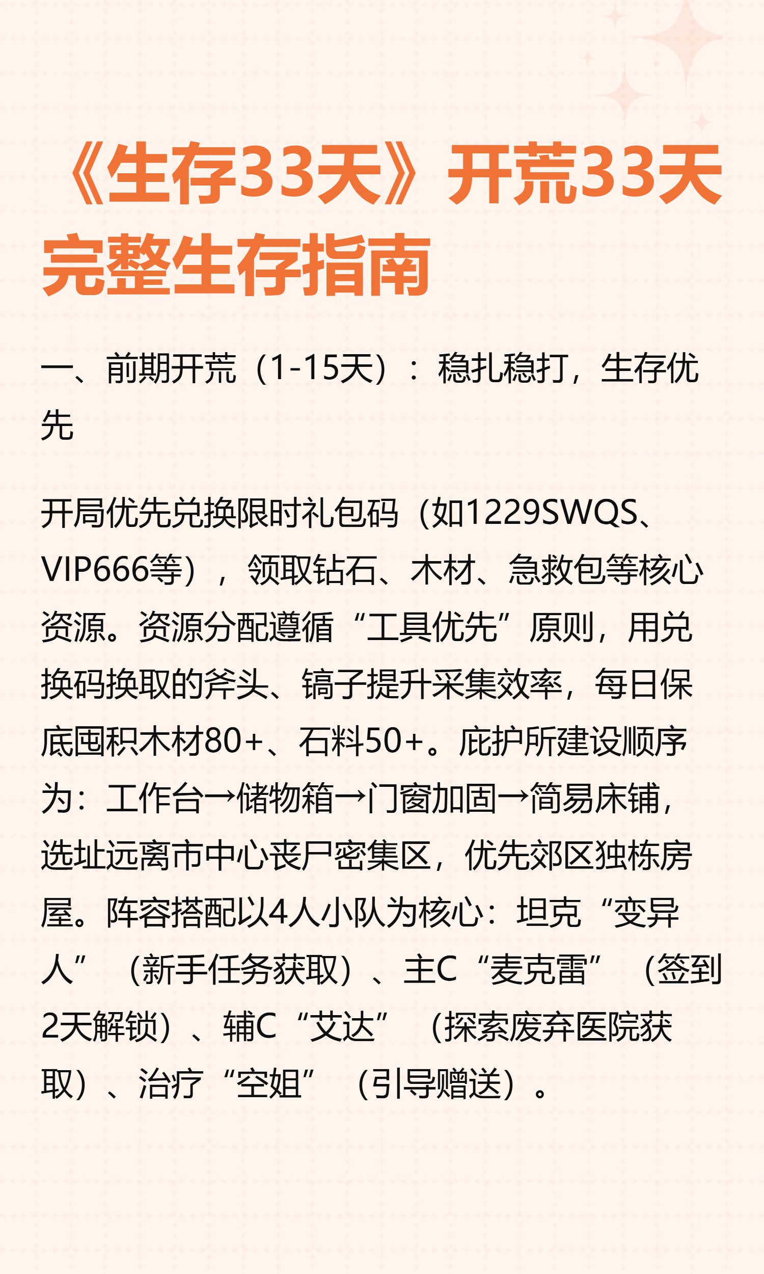 礼包码:VIP777、VIP888、VIP999、发电机万岁、最后一颗子弹、生存33天、罐罐不绝 即可稳定领取钻石、罐头等必需物资,为生存之旅奠定基础。