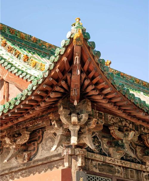 琉璃鸱吻:殿顶正脊的琉璃鸱吻高1.8米,龙首怒目,尾卷祥云,是金代琉璃的典型代表,“龙嘴里的‘宝珠’是空心陶球,风吹过会发出‘呜呜’声,像在和藻井的彩绘对话。”李工说。