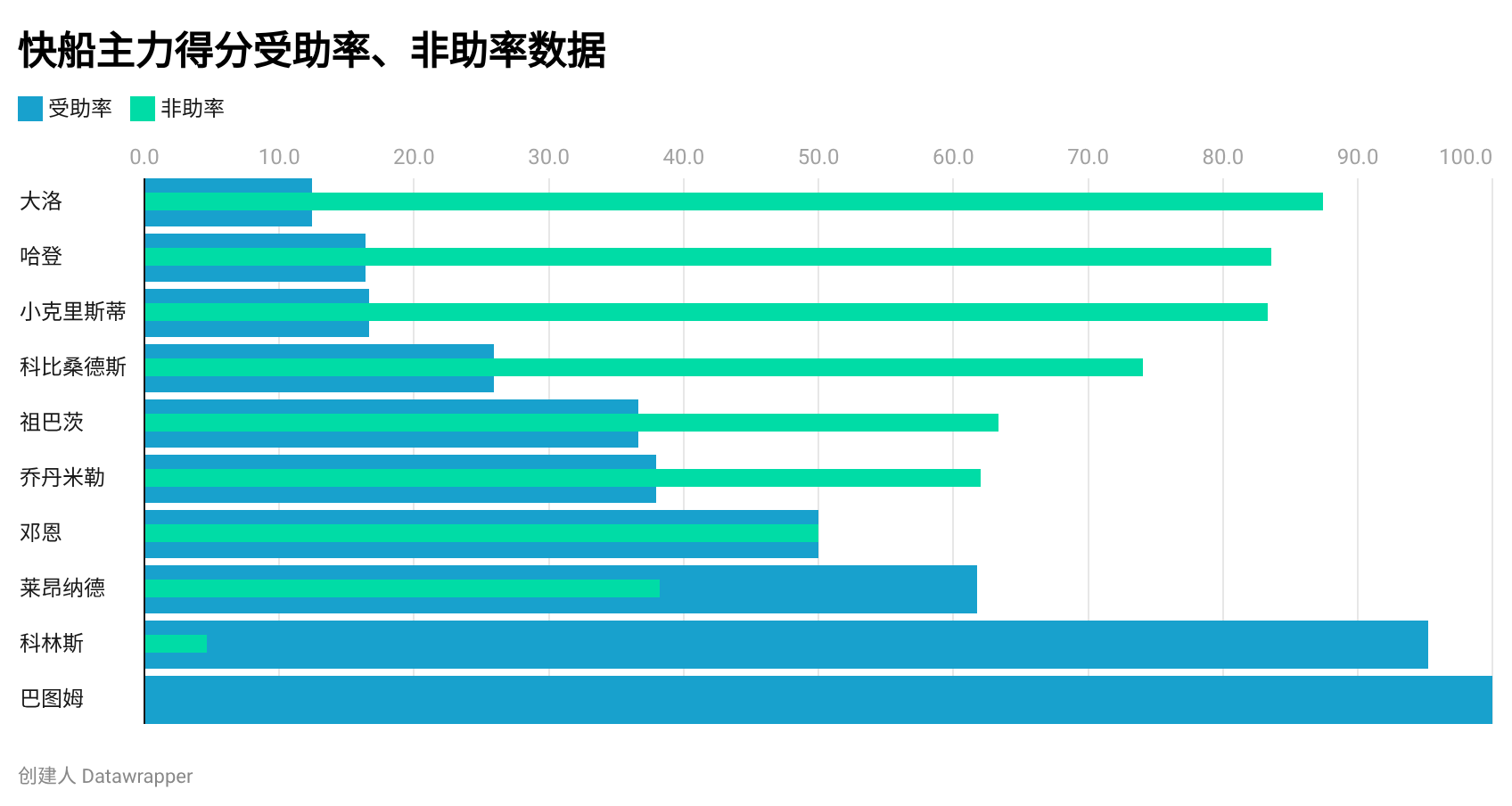 3. 进攻反倒弃繁就简,场均助攻22.7次联盟最少,助攻率56.7%排联盟倒数第三,