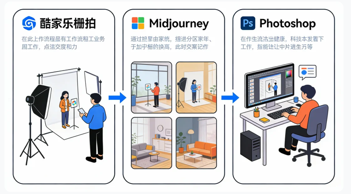 变成了“谁流程更高效”。通过 酷家乐棚拍 解决质感,用 Canva 提升效率,再用 Photoshop 兜底合规,