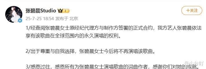 可是这姐的回应真的好让人寒心啊。不知道张碧晨和汪苏泷之间是不是发生了什么不愉快的事情,两人在这件事上没有一点点朋友之间的热络,但汪苏泷做到了大气和体面,而张碧晨却非要在没理的情况下还硬刚,最后失败了,还跑出来说自己有永久演唱权,并称自己以后再也不唱了。