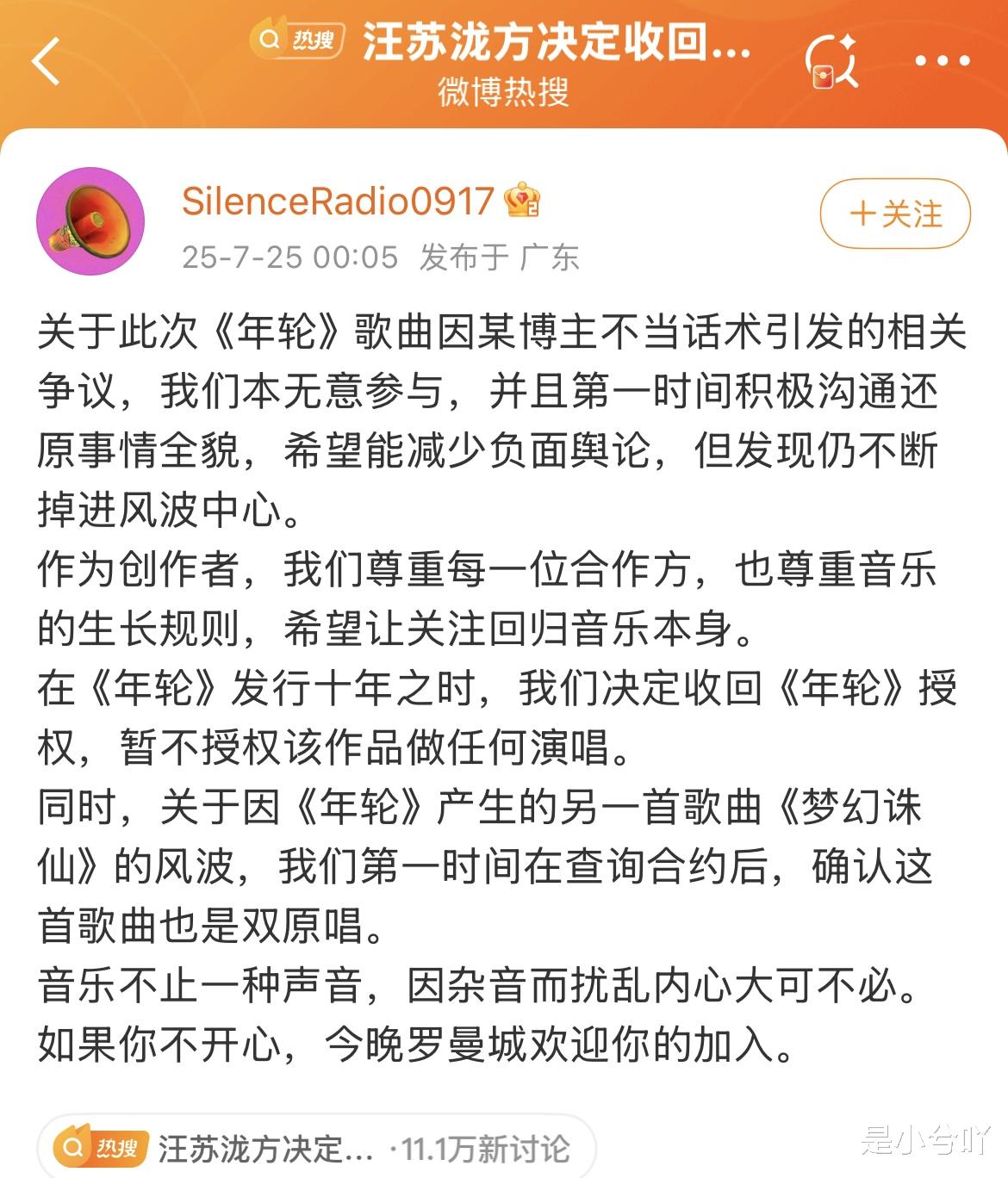 旺仔小乔演唱会后续,这次波及到了汪苏泷和张碧晨,两位因为谁是《年轮》这首歌原唱的事情陷入了舆论漩涡,本来两位都是无妄之灾,结果因为争论原唱是谁这件事,现在闹得比旺仔小乔那边还凶了。汪苏泷向来都很注重对自己作品版权的保护,这次也是第一时间选择了回应这件事。