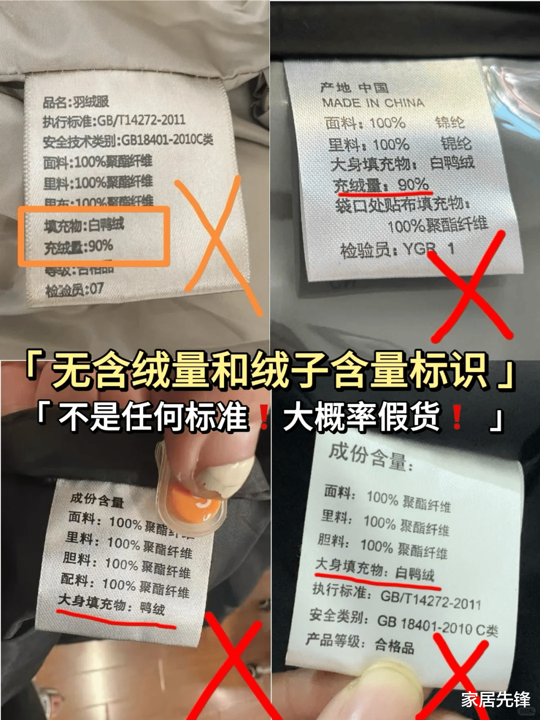 比如,很多商家为了吸引眼球,标签上就会写一些模糊的描述,比如含绒量90%,却不提绒子含量,其实就是因为他的羽绒服掺了大量的劣质材料,我们消费者根本无从分辨,只能当冤大头。