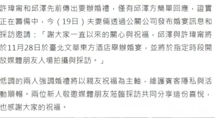 11月19日,邱泽许玮甯这对已经登记结婚4年的夫妻,高调官宣将在11月28日举办婚礼,地点在文华东方酒店。
