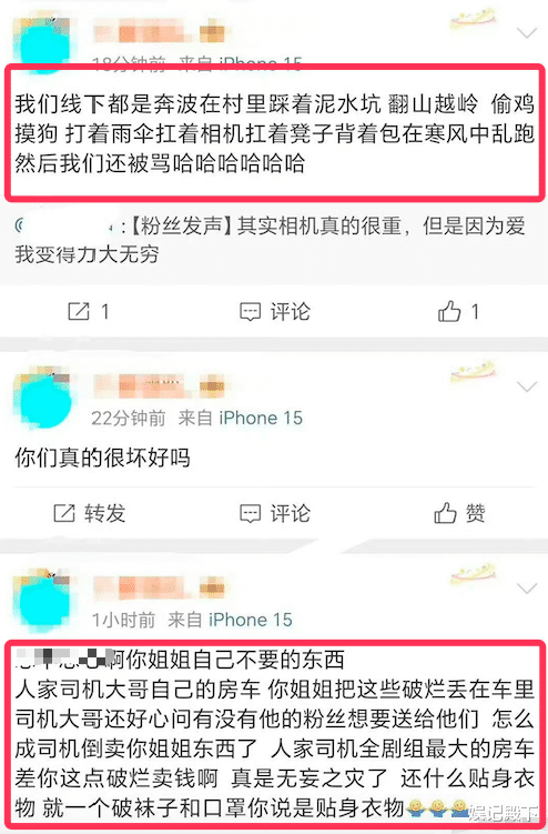 有人表示:“司机大哥偶尔下来跟粉丝们聊天,很保护你的隐私,那时候我不认识你的房车,我还问这是谁的,司机大哥根本不说,现场一共就两个房车,司机大哥都不说这是你的,私底下人家一直夸你很好很漂亮什么的,结果呢,你丢弃粉丝的东西,大哥收拾出来想要送给她们,你被爆出来了就说是司机大哥倒卖偷拍,你有没有心啊”。