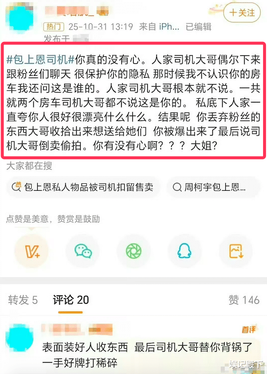 随后该名粉丝在网上询问此事,也因此被不少人所关注,鉴于之前另一位女演员曾黎的前车之鉴,包上恩不得不找个更加稳妥的理由,于是便把矛头指向了该名司机。