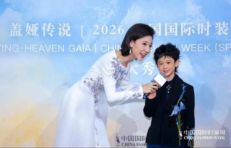 2026中国国际时装周(春季)盖娅传说开幕大秀现场,北京电视台主持人李杨薇身着带有精致中式刺绣的白色礼服,以温婉大气的姿态,对话童模、蔡国庆之子蔡承勋。