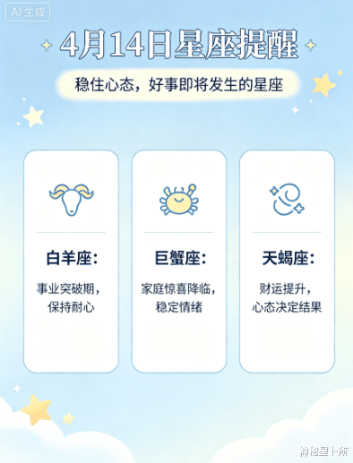 其实所有星座的好运,从来都不是凭空而来,而是心态稳住后的水到渠成。4 月 14 日,不用急着要结果,不用逼自己完美,少一点焦虑,多一点从容;少一点内耗,多一点行动。